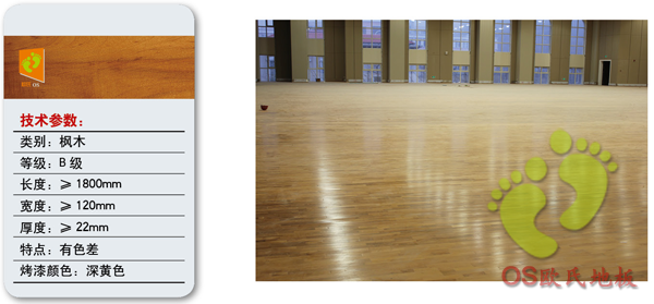 面層地板:楓木、柞木,體育運(yùn)動(dòng)木地板厚18mm至22mmm  寬為50mm至130mm  長(zhǎng)度為300mm至2400mm;